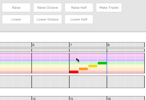 Five octaves are supported. To change the octave of a note, click the note (it will light up) and: