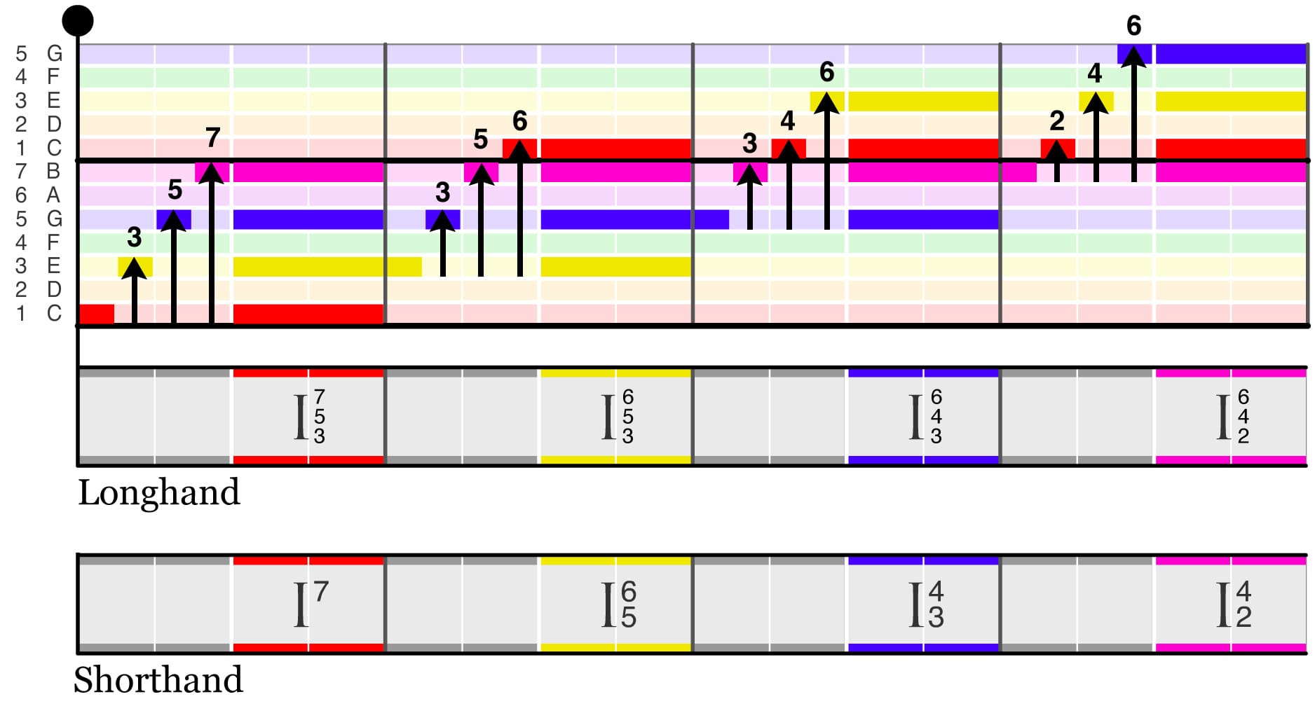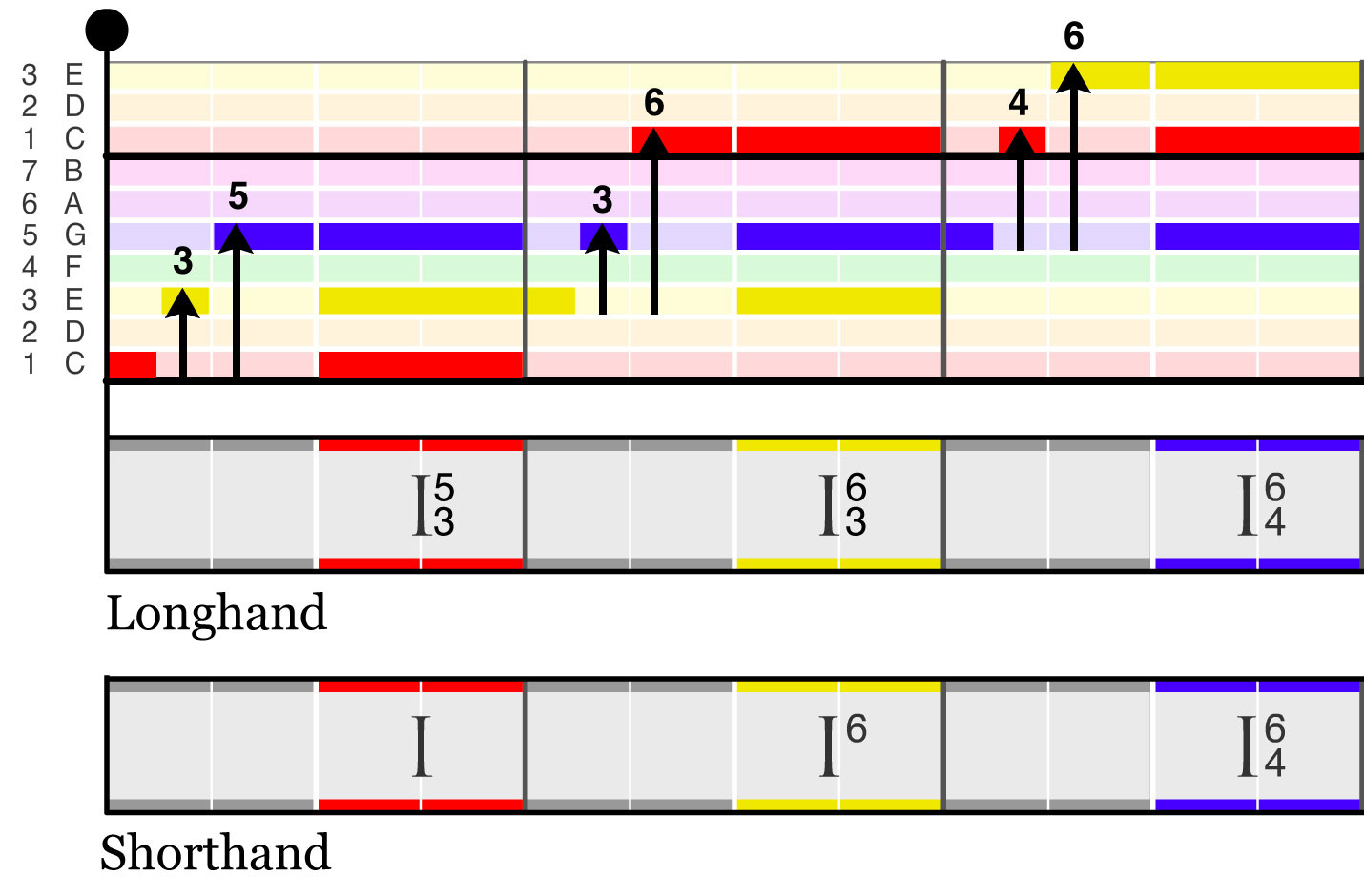 Below is a demonstration of a I chord in all its inversions, written as individual notes in the melody staff so you can hear how each one sounds: